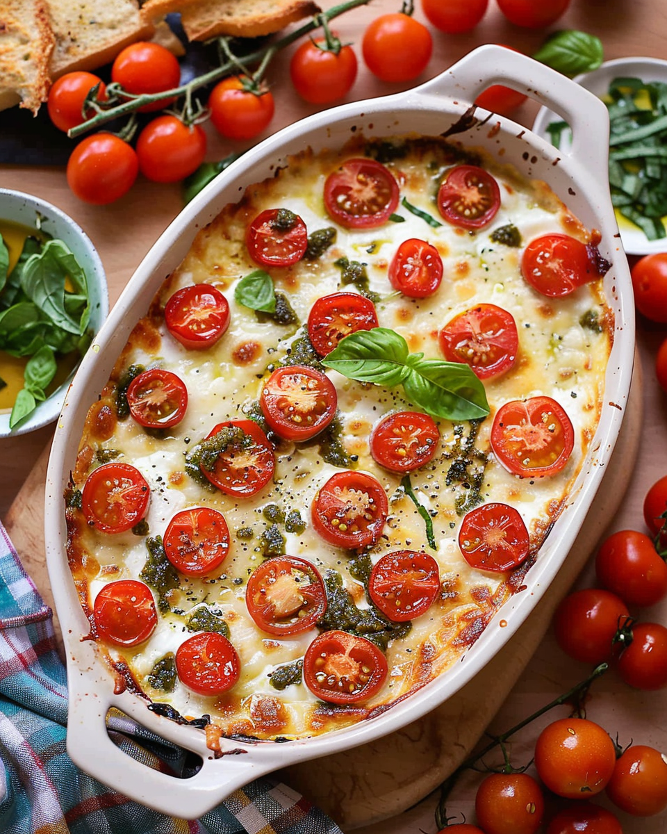 If you’re a fan of the classic Caprese salad, you’re going to fall head over heels for this warm and cheesy Caprese dip! Bursting with