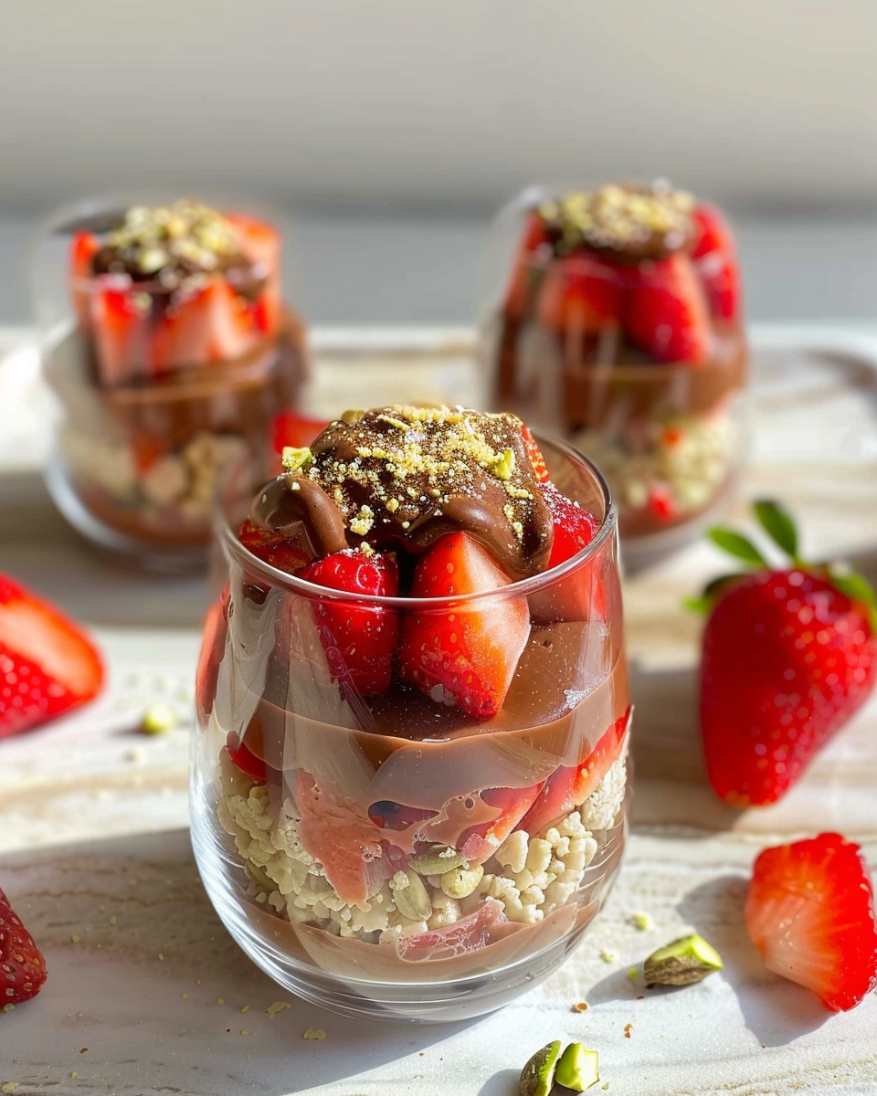 This recipe puts a delightful twist on the viral Dubai chocolate bar, combining layers of velvety chocolate, juicy strawberries, crisp kataifi pastry, and creamy pistachio