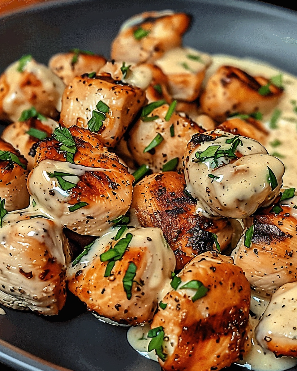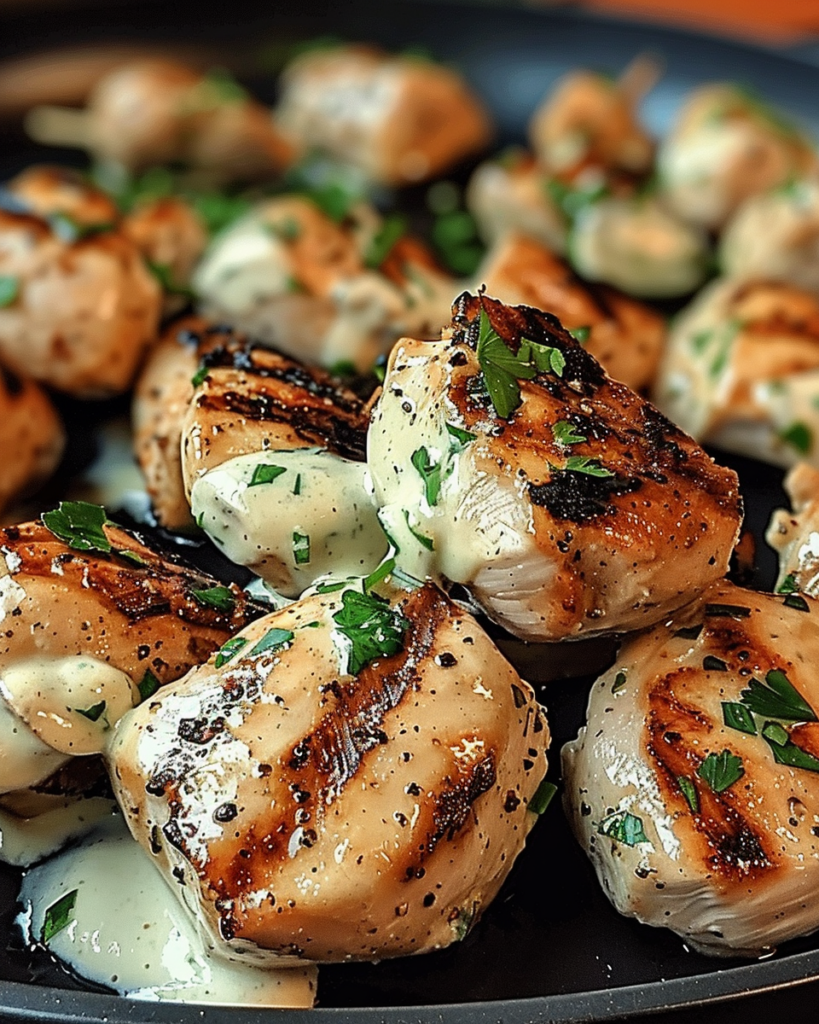 Grilled Chicken Bites with Creamy Garlic Sauce – Tender, juicy grilled chicken with a luxuriously creamy garlic sauce. Perfect for easy family dinners, BBQs, meal prep, and parties. Quick to make with simple ingredients. Serves 4-6.